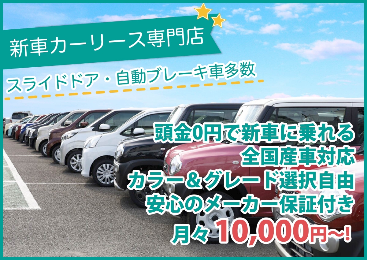 現金で購入する場合には、あらかじめ一定のまとまった資金を準備する必要がありますが、より多くの福山市・府中市・尾道市・神石・笠岡市・井原市エリアのお客様にご利用頂けるよう、当店のカーリースは、頭金を入れずに新車をご利用いただくことができます!